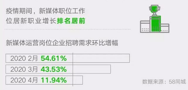 2020年以来,面对新冠肺炎疫情的冲击,线上业务的爆发性增长,数字化就业逆势上扬。流量运营、社群运营、短视频运营、公众号运营等岗位需求大幅增加。新媒体运营在新职位增长排名靠前。